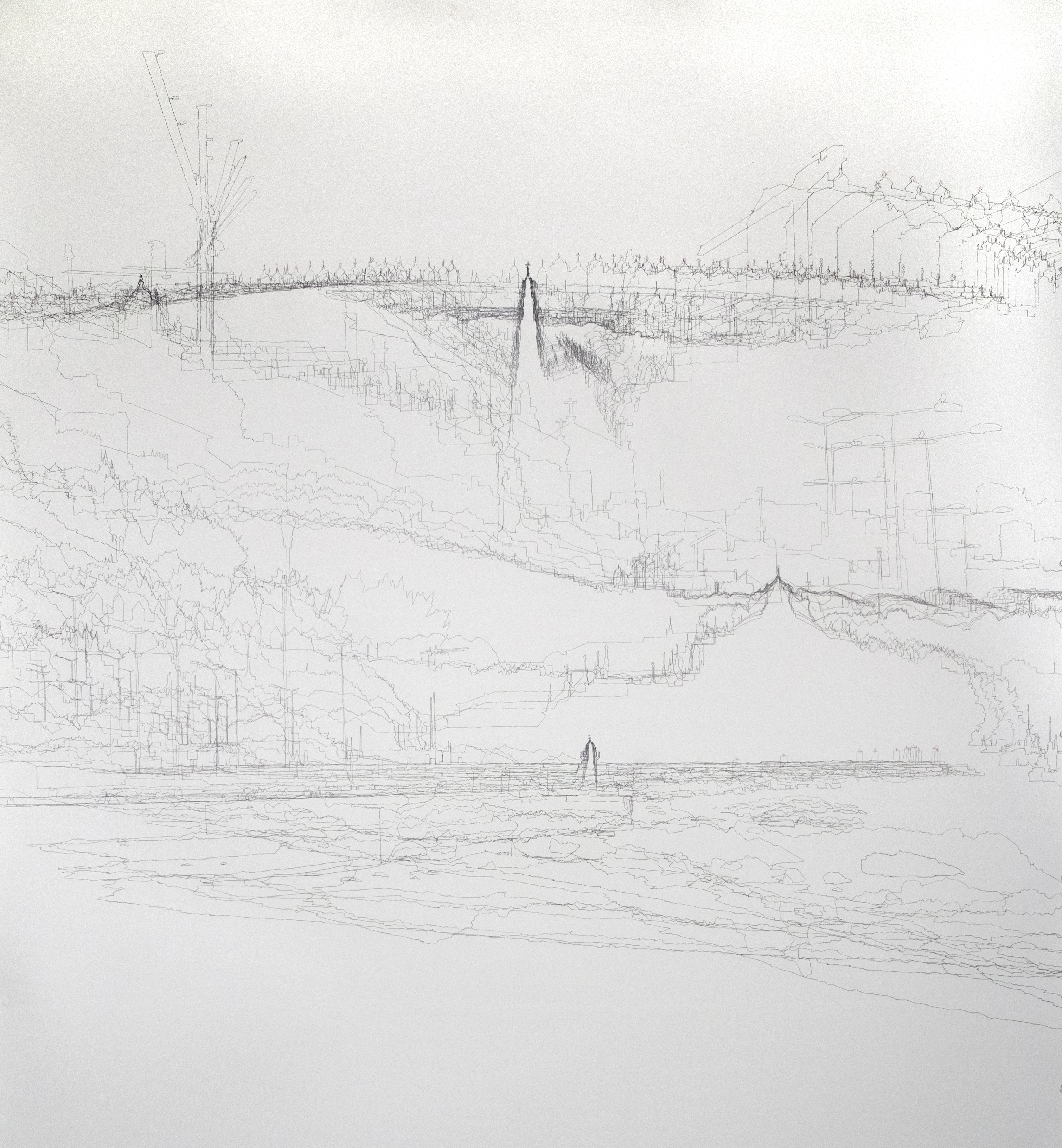 Each drawing is an “automatic cartography,” constructed from photographs taken at regular intervals during a walk, stalking a particular point on the horizon, such as a bell tower, dome, or obelisk. The topography of each drawing is the accumulation of the horizon lines from the set of photographs, projected and traced sequentially.